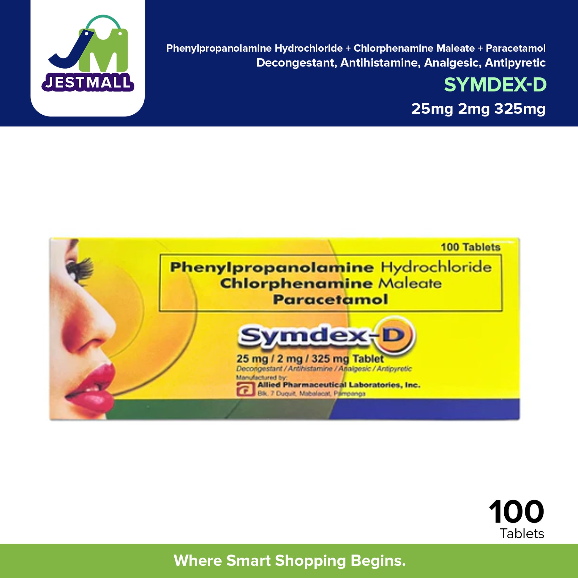 SYMDEX-D Tablets combine Phenylpropanolamine Hydrochloride, Chlorphenamine Maleate, and Paracetamol in one convenient formulation. Each tablet contains 25mg of Phenylpropanolamine, 2mg of Chlorphenamine, and 325mg of Paracetamol, designed to support relief from common cold and allergy-related discomforts. This pack of 100 tablets offers a practical option for managing seasonal or occasional needs.